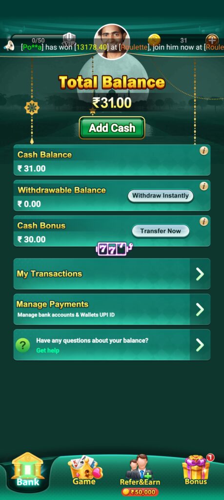without deposit withdrawal bhi hai yani ki aap sign upon ke rupaye se game play karke aur rupaye Jeet kar Bina deposite kiye hue real cash rupya Apne account mein withdrawal kar sakte hain.
